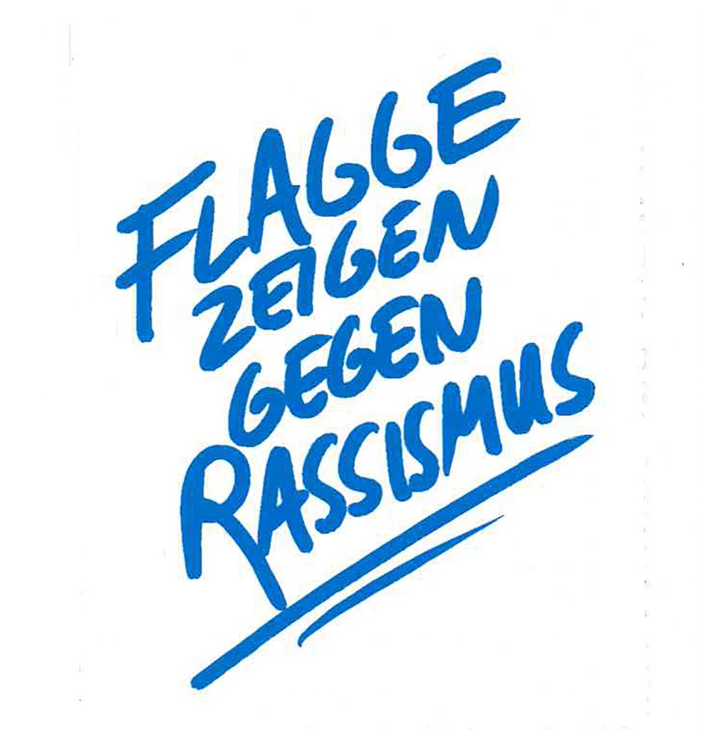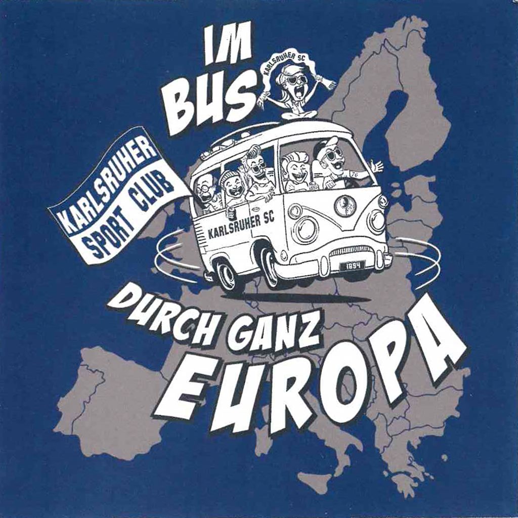 Vor dem Lokal entdeckt ihr verschiedene Sticker und Plakate. Ein Laternenpfahl daneben ist fast komplett zugeklebt – wie ein stummer Zeuge zahlloser Spieltage.